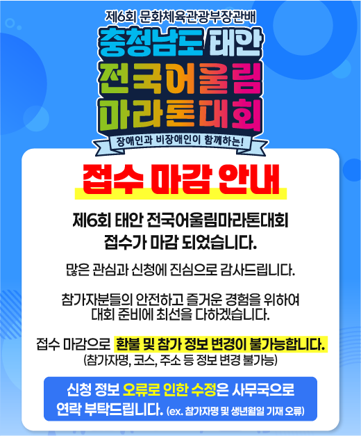 안녕하세요. 제6회 태안 전국어울림마라톤대회 사무국입니다.